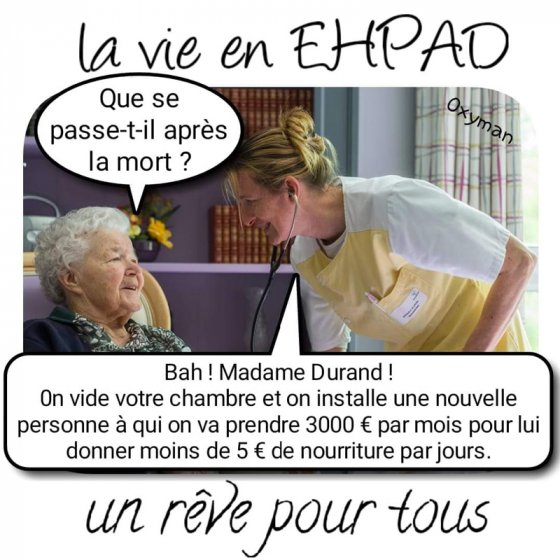 Côté public, les 43% restants, ce n'est évidemment pas mieux avec des gouvernements successifs appliquant à la lettre les directives et traités européens (horreur, des services publics !), diminuant drastiquement les budgets, cherchant là aussi la rentabilité, comme avec l'hôpital public. Et on supprime du personnel, et on minute les toilettes (6 minutes par Vieux) et on leur prépare de succulents repas « type » : une mauvaise soupe, une vache qui rit, une compote dégueulasse et un morceau de pain... Pour 2000 ou 3000 € par mois !